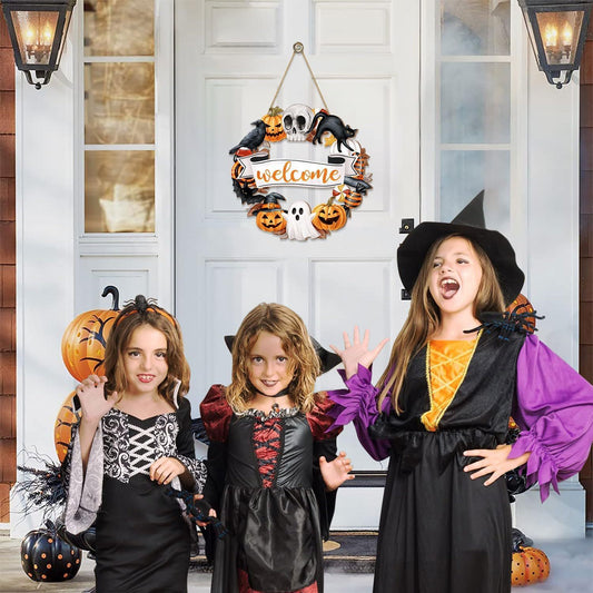 Halloween Wooden Wreath Black Cat Pumpkin Skull Sign