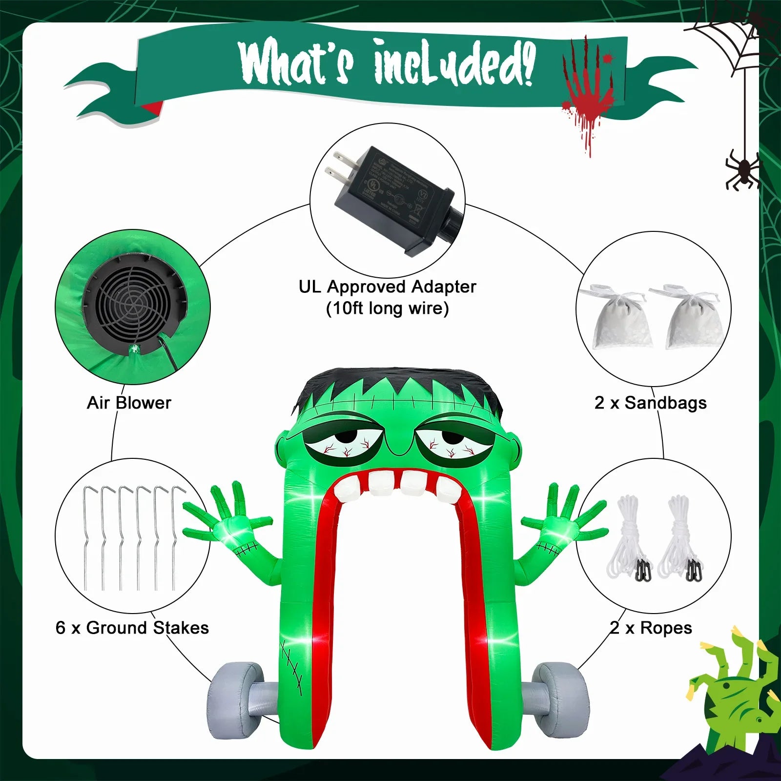 Bring the classic Halloween spirit to your yard with this 6ft tall Frankenstein inflatable decoration. Made from high-quality 210T fabric, this inflatable is built to last through wind and rain. It comes equipped with 6 ground stakes and 2 sandbags to ensure stability, even in strong winds. The detailed Frankenstein design will capture the attention of trick-or-treaters and guests, adding a touch of spookiness to your outdoor Halloween setup. Simple to install and durable, this inflatable is a must-have for creating a memorable Halloween display.