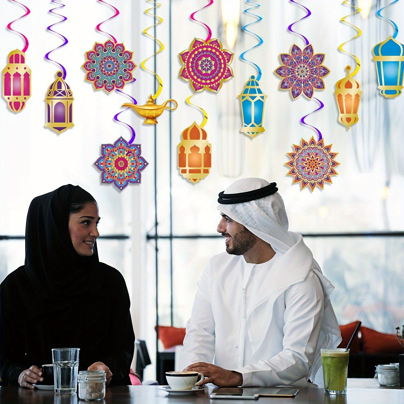Celebrate Ramadan and Eid Al-Fitr with the NNETM 12pcs Ramadan Mubarak Decorations Set. This elegant party decor set features a mix of paper and PVC lantern petals and swirl ceiling hangings, designed to bring a festive touch to your home or event. Ideal for Muslim celebrations, these decorations are simple to set up and reuse. Refer to the image for exact dimensions.