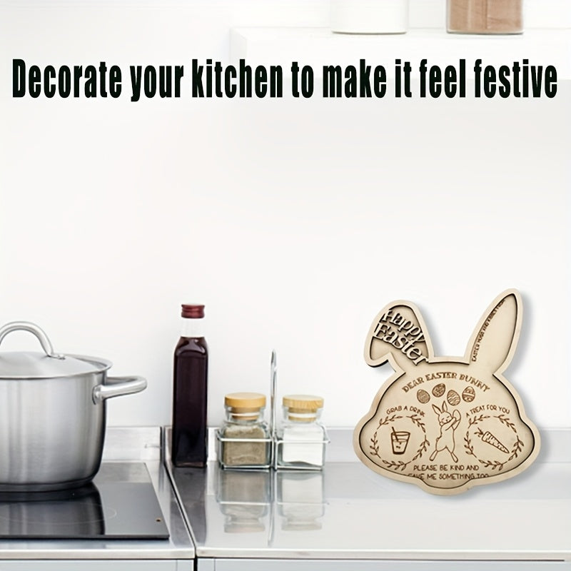The NNETM Easter Bunny Wooden Tray Centerpiece brings the spirit of Easter to your home with its charming bunny silhouette and festive "HAPPY EASTER" text. This 25 cm manufactured wood tray is perfect for placing in the center of your table or using as a decorative coaster. The rustic finish and modern design blend well with farmhouse-style interiors, making it a must-have for your Easter celebrations. Refer to the image for product dimensions.