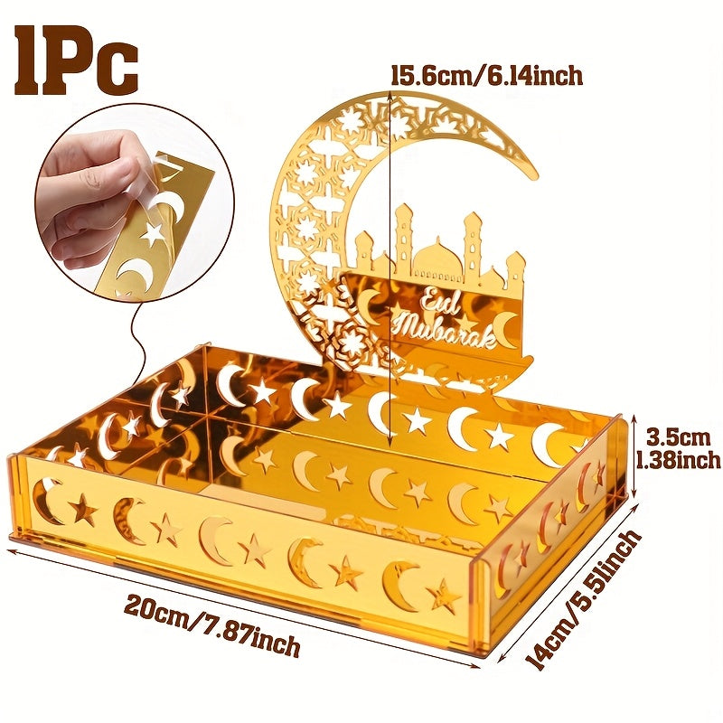 The NNETM Elegant Crescent Moon & Star Acrylic Tray is the perfect addition to your Ramadan and Eid Mubarak celebrations. Featuring a classic crescent moon and star silhouette, this stylish tray enhances your festive decor with a sophisticated touch. Made from durable acrylic, it is designed for long-lasting use and doesn’t require any power or batteries. Refer to the image for product dimensions.