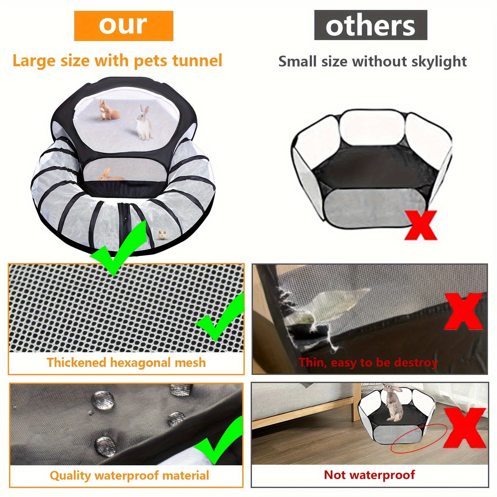 The Foldable Small Animal Playpen with Tunnel is the perfect pet accessory for owners looking to provide a secure and playful space for their small companions. Designed with a breathable mesh and durable PE material, this portable playpen is ideal for both indoor and outdoor use. The added tunnel encourages exploration and play, making it suitable for cats, small dogs, and other tiny pets.