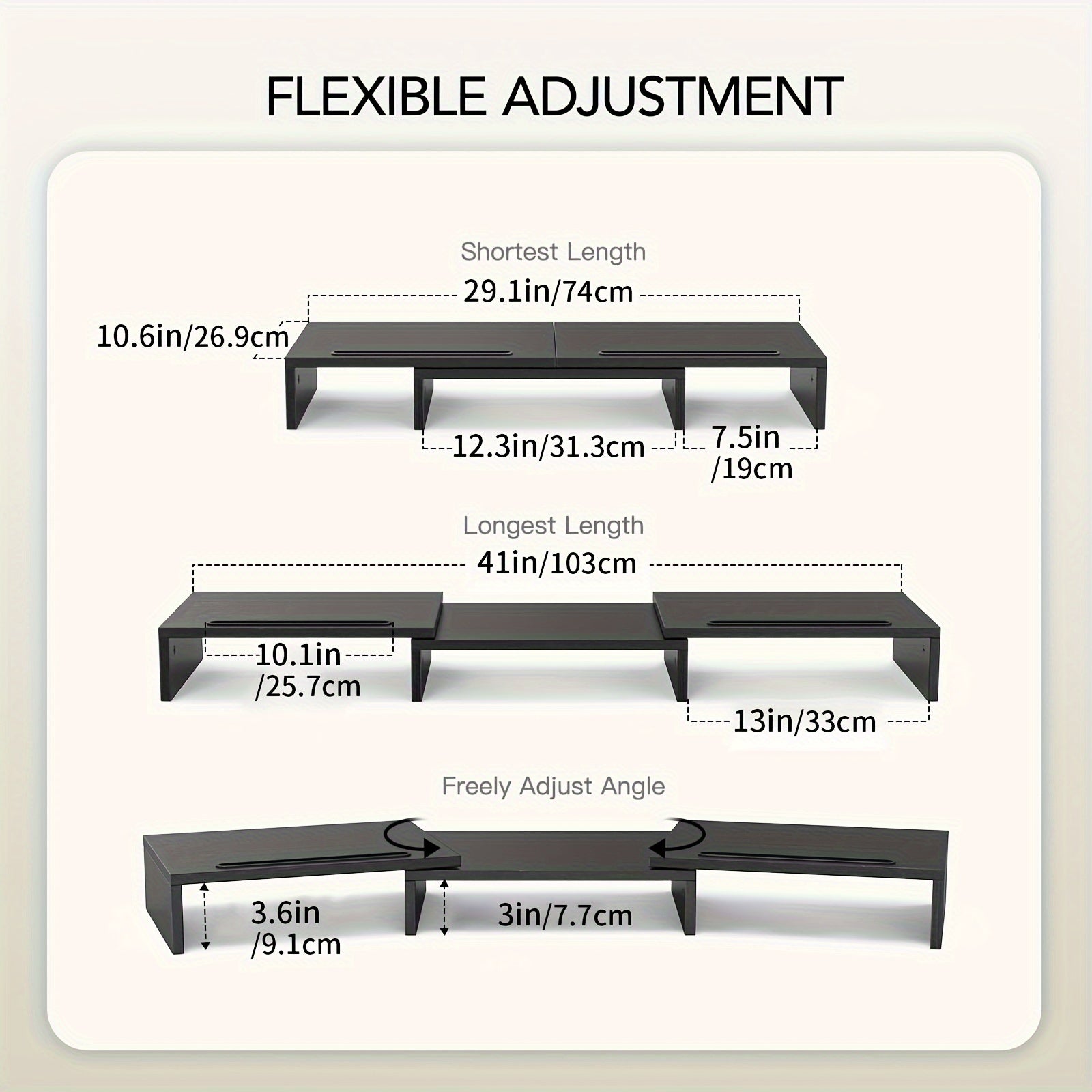 The 2-Slot Adjustable Dual Monitor Stand is designed to enhance your desktop organization. With sturdy black hardwood construction, it provides ample storage space for your computer accessories while keeping your monitors at the perfect ergonomic height. The adjustable slots allow you to customize your setup, ensuring a perfect fit for various monitor sizes. Refer to the image for exact dimensions.