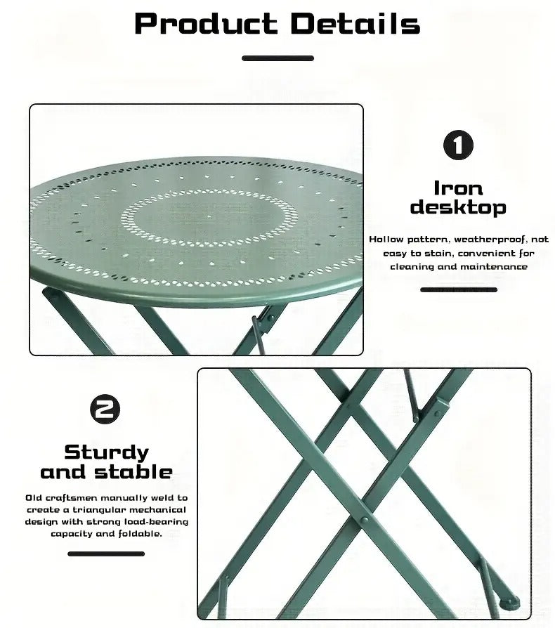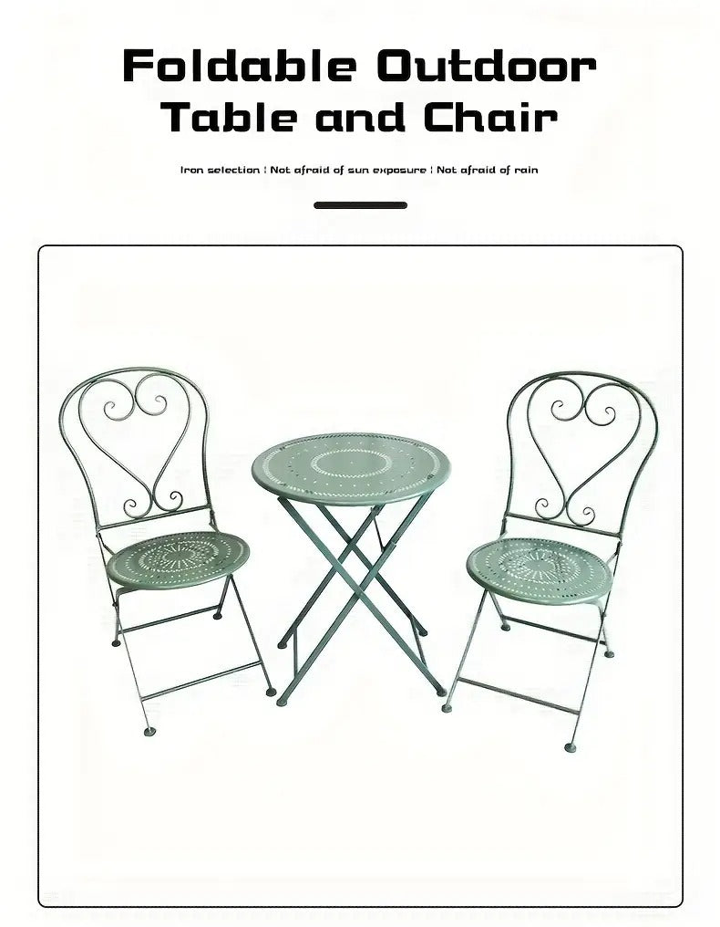 The  RV Camping Foldable Outdoor Bar Set 3pcs is designed for convenience and versatility in any space. Its foldable structure makes it easy to transport, store, and set up whenever needed. The rust-resistant finish ensures reliable use whether indoors or outdoors, making it ideal for RVs, balconies, gardens, porches, and patios. The set includes one table and two chairs, crafted from durable iron for stability.