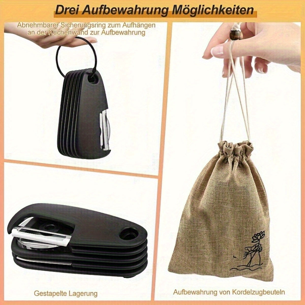 The 6pcs Stainless Steel Kitchen Gadget Set is an essential tool kit for RV enthusiasts, campers, and home kitchens. Each item is designed with ergonomics in mind, making food preparation easier whether you're on the road or at home. This set includes a pizza cutter, fruit peeler, herb stripper, bottle opener, grinder, and cheese grater, all made from durable stainless steel and BPA-free ABS plastic. The compact design allows easy storage in the included pouch or in your kitchen drawer. Refer to the image for detailed dimensions and how each tool fits perfectly into the set.