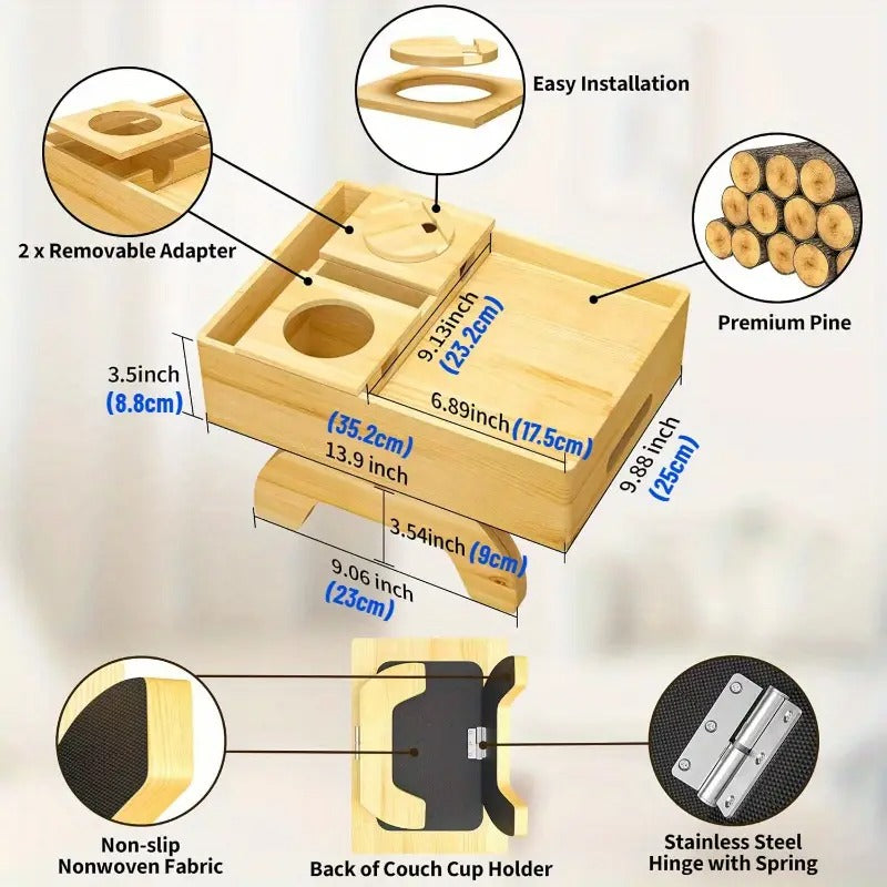 The  7-in-1 Sofa Cup Holder combines convenience and functionality in a compact, modern design. This all-in-one unit includes a cup holder, side table, phone mount, and a storage drawer — ideal for keeping your essentials close. Whether you're watching, lounging, or working, the rotating phone holder and clip-on table adapt to your needs.