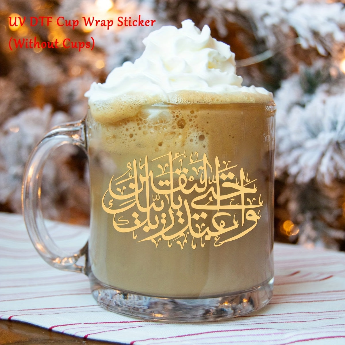 Golden Arabic calligraphy UV DTF transfer stickers perfect for glasses, mugs, and DIY craft projects.