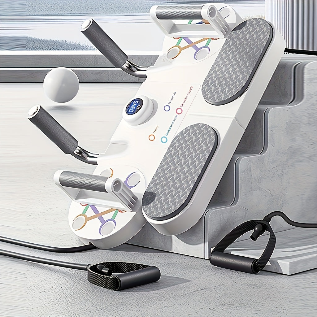 The  Adjustable Push-Up Bar is your compact solution for full-body training at home. Equipped with resistance bands, a timer, and tablet holder, this smart system helps you perform effective push-ups, pull-ups, and core exercises anywhere. Designed with textured grips and a sturdy base, it’s perfect for daily fitness routines with comfort and stability.