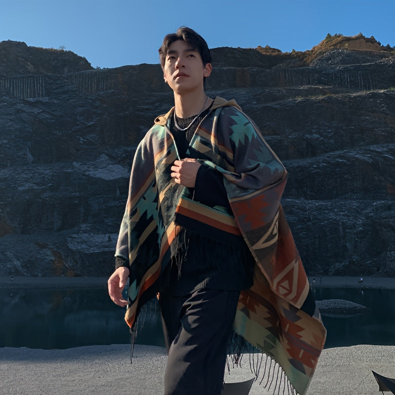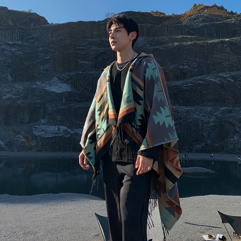Stylish warmth meets bohemian charm with the Geometric Shawl Wrap. Perfect for outdoor outings, this cozy jacquard-crafted cape offers decorative flair and reliable wind protection.