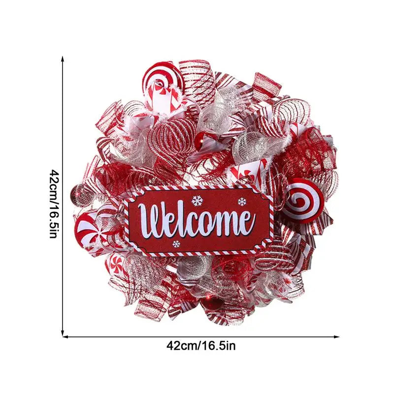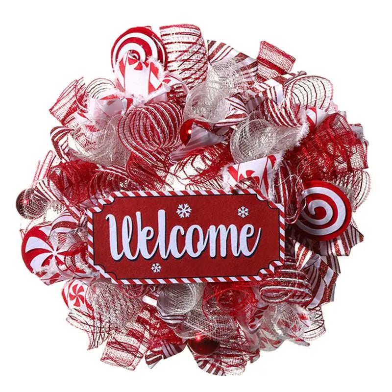 Welcome the holiday season with NNEOBA's Christmas Pink Wreath. Designed with vibrant red and white ribbons, festive ornaments, and peppermint candy, it adds a touch of holiday spirit to your front door. Crafted from durable mesh fabric, it maintains its color and form all season long. This wreath requires no assembly and is easy to display on doors, windows, or mantels, making it a versatile addition to your festive décor.