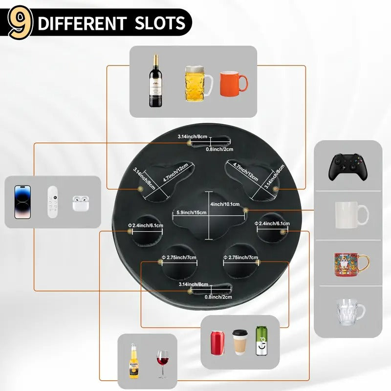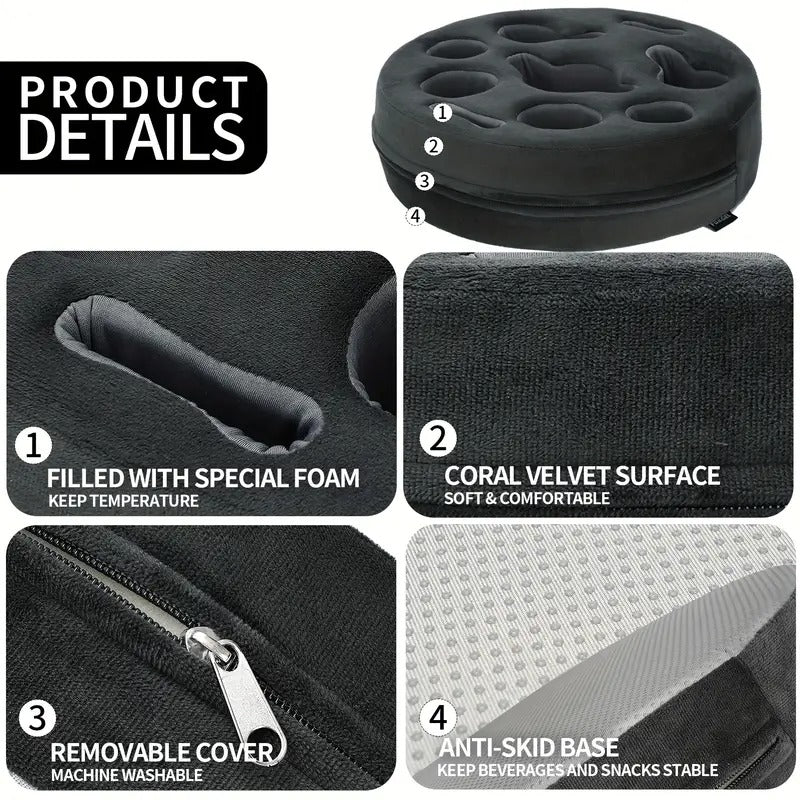The Couch Cup Holder Pillow is designed to keep your essentials organized and your drinks secured while lounging. With 2.5 cm deep cup holders, it accommodates most mug, can, and short bottle sizes without tipping or spilling. This versatile sofa organizer is perfect for storing snacks, remotes, and phones, helping you relax without clutter.