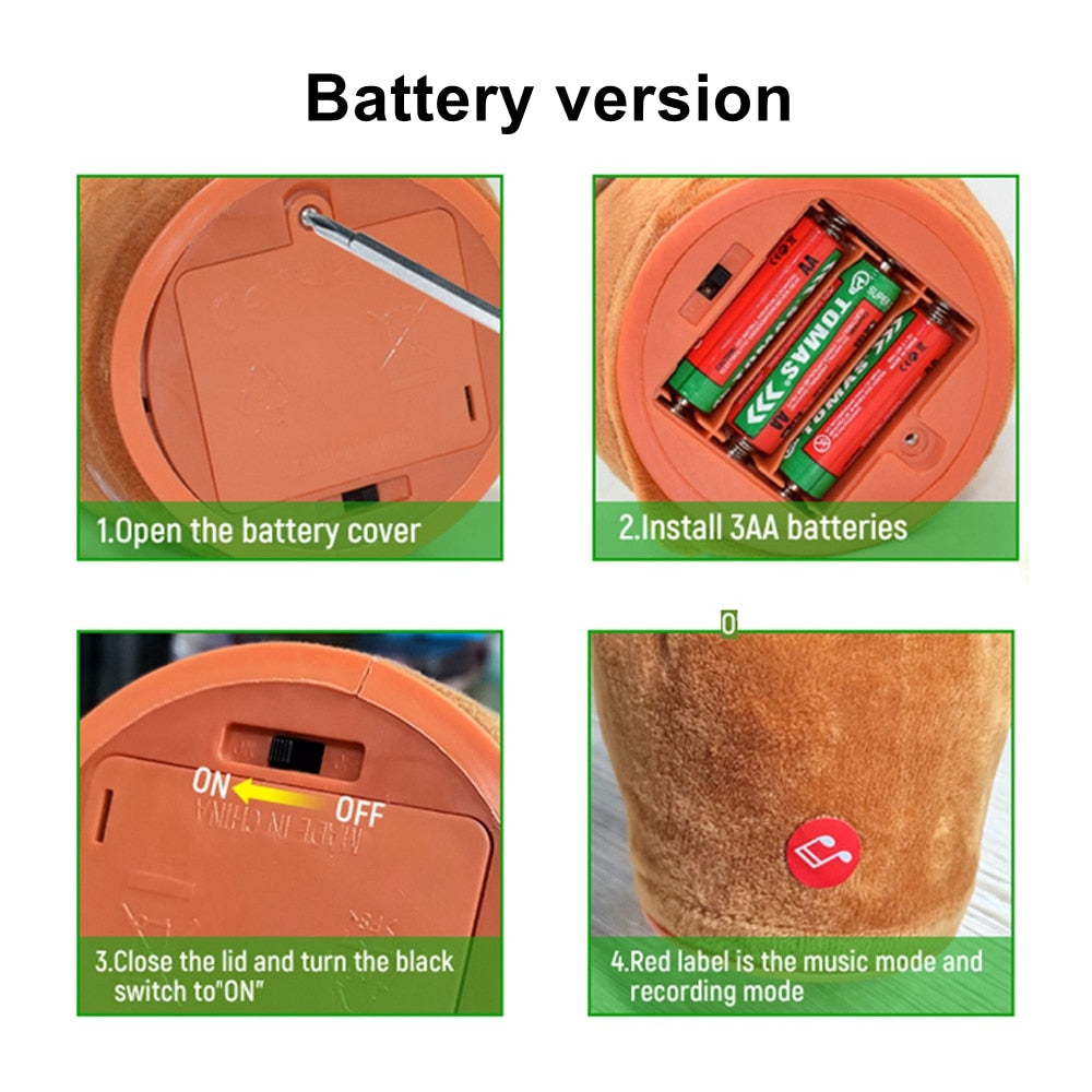 - 3. Instruction- Load the batteries and press the button, the plush will sway and sing songs! Since the doll contains electronic components, it's recommended to be wiped off the dust with a damp cloth.