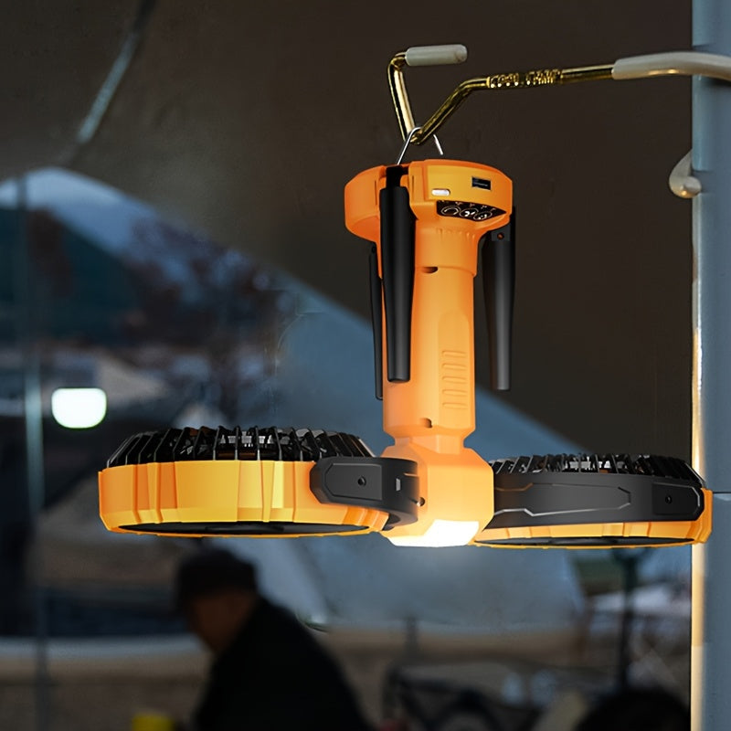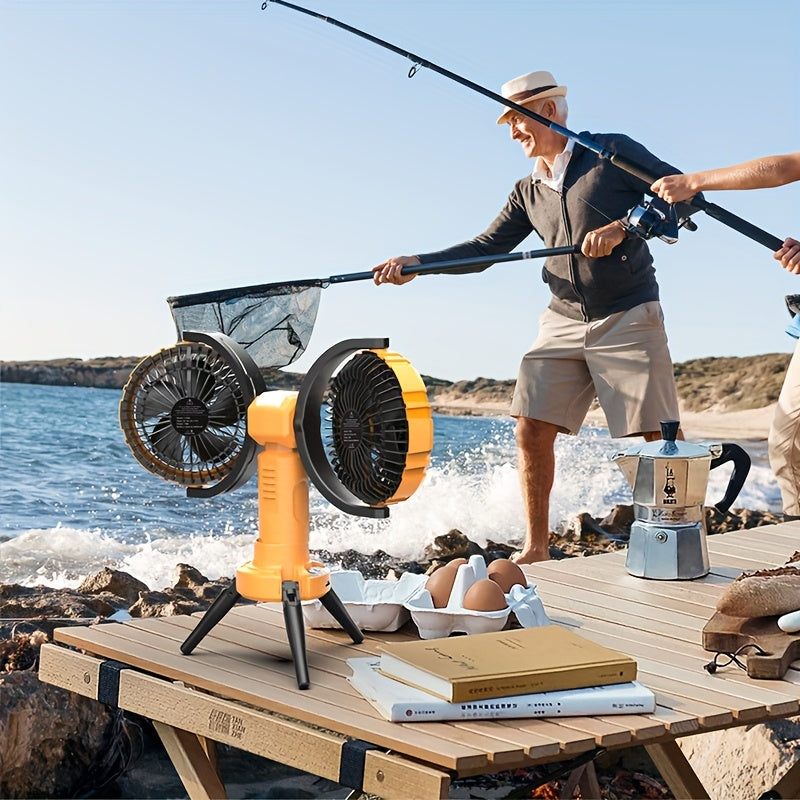 Experience powerful, adjustable cooling wherever you go with the  Dual-Head Rechargeable Desk Fan. Designed with a 270-degree oscillating function and four fan speeds, it delivers customizable airflow for both indoor and outdoor settings. Its dual-head design enhances air circulation while the built-in lithium battery provides long-lasting operation without needing constant recharging. Use it at your desk, on a camping trip, or during backyard gatherings.