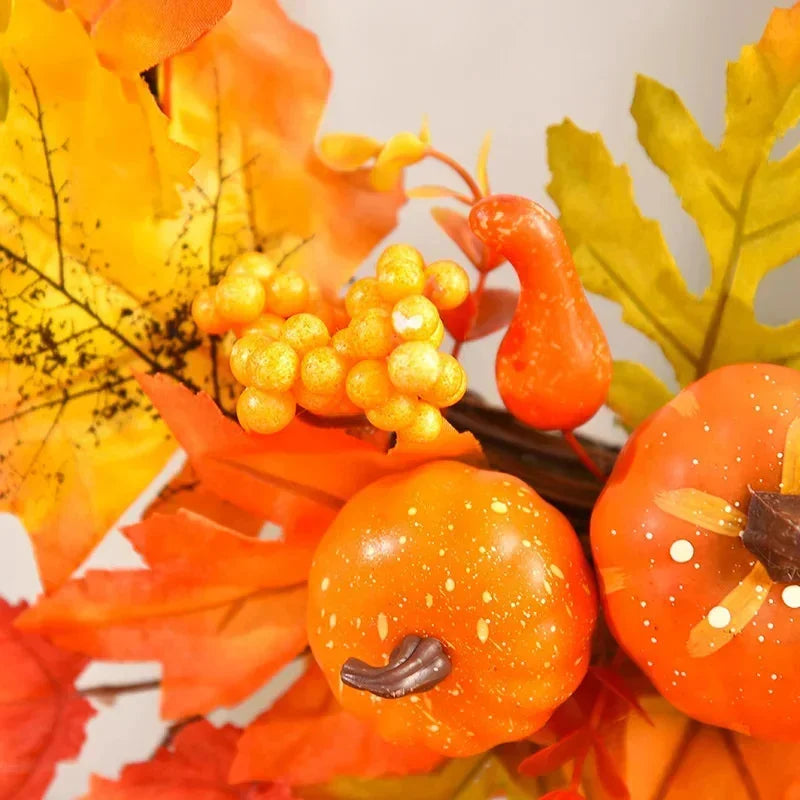 Enhance your space with a stunning autumn wreath featuring pumpkins, berries, and maple leaves.