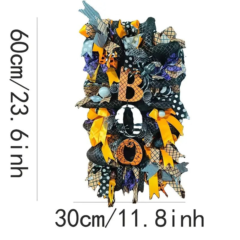Celebrate Halloween with the Halloween BOO Garland, featuring a pumpkin and haunted house design with decorative ribbons, bows, and faux flowers. This festive wall and yard display adds the perfect seasonal touch to parties, entrances, or garden décor.