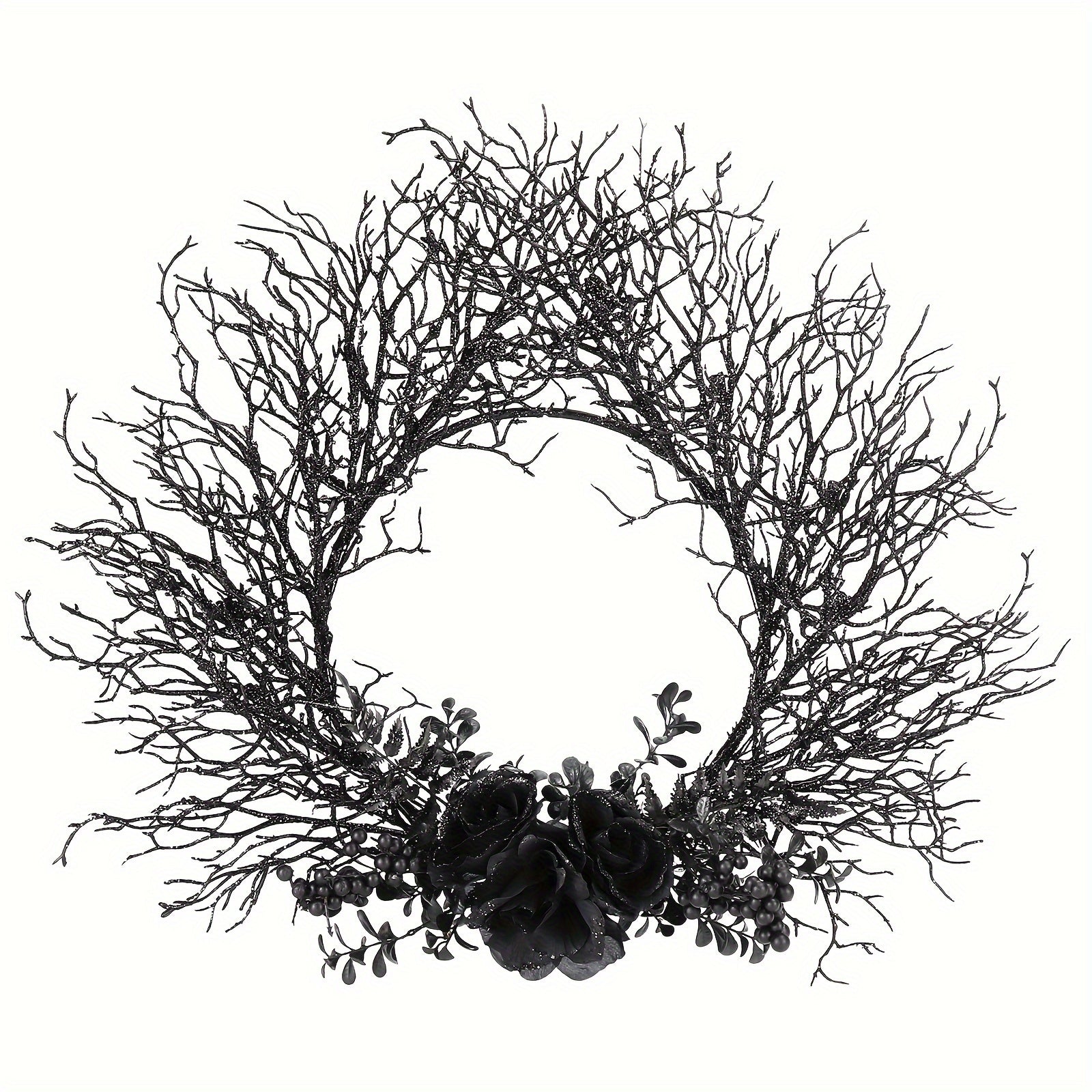The Halloween Deadwood Wreath is designed to create a striking centerpiece for your spooky holiday décor. Featuring black roses and glittered twigs, it is ideal for walls, doors, or indoor displays. Dimensions are 55.2 cm x 53.2 cm — refer to the image for a closer look before decorating your home.