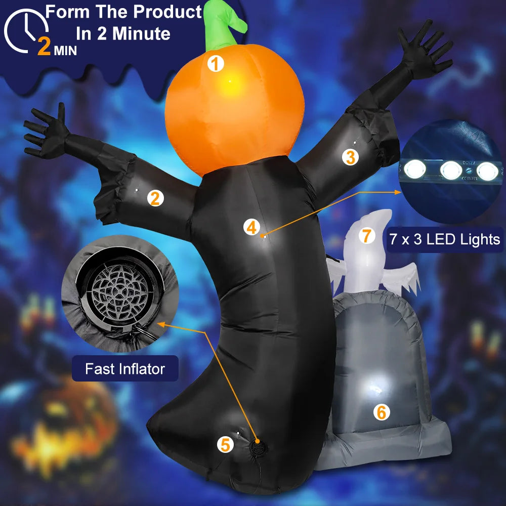 Create a spooky Halloween vibe with this LED-lit inflatable pumpkin skeleton tombstone ghost for your yard or party decor!