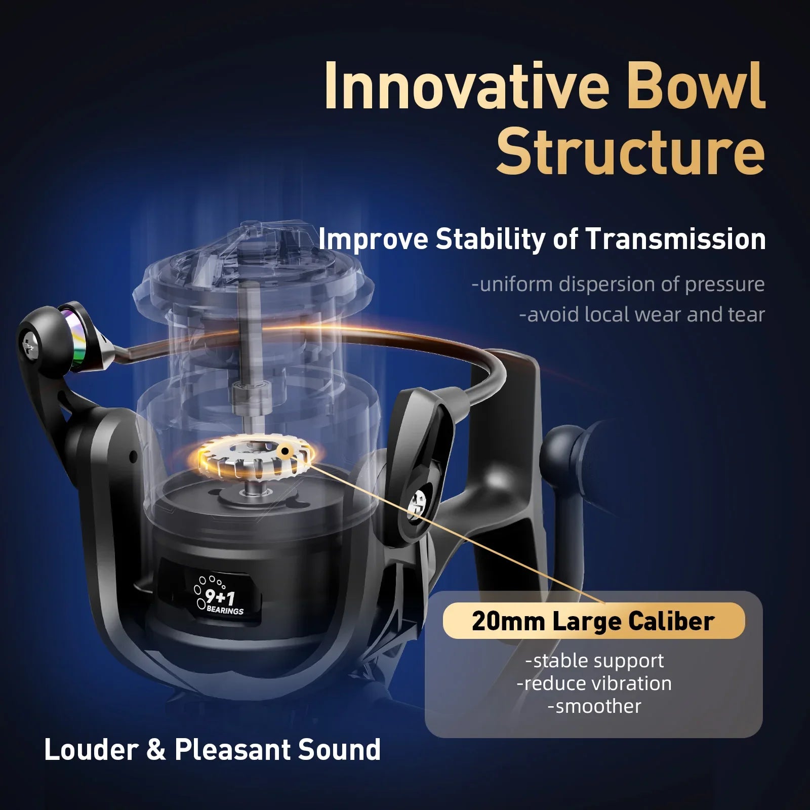 Inside, the 9+1 anti-corrosion bearing system is designed for enhanced transmission, smoother operation, and precise fish control. Premium internal components like the brass gear shaft, steel main shaft, and rainbow ceramic line guide make this reel a true workhorse on the water. Whether you're after saltwater giants or trophy freshwater species, this spinning reel offers elite-level durability, performance, and comfort—designed to handle the toughest catches.