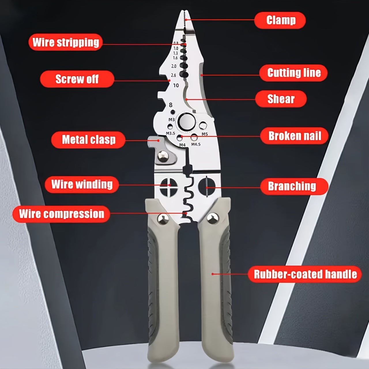 The Industrial Multi-Functional Wire Stripper and Cutter is an essential tool for any electrical project. Its non-slip grips ensure a secure hold, making wire stripping and cutting easy and accurate. Constructed from high-quality metal, this tool is built to handle tough jobs while maintaining long-lasting performance. Ideal for electricians and DIY enthusiasts alike.