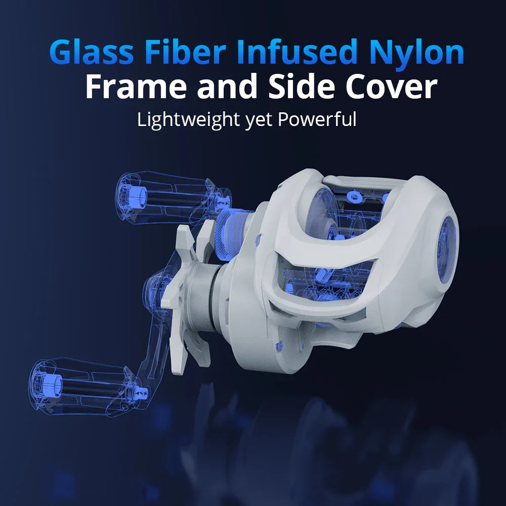 Constructed with a glass fiber-infused nylon frame, it offers a strong yet lightweight build that resists corrosion and wear, while the aluminum spool and handle add smoothness and durability. Designed for right-handed use, this reel is ideal for freshwater and light saltwater applications, whether you're targeting bass, trout, or other aggressive species. Built to perform, cast after cast.