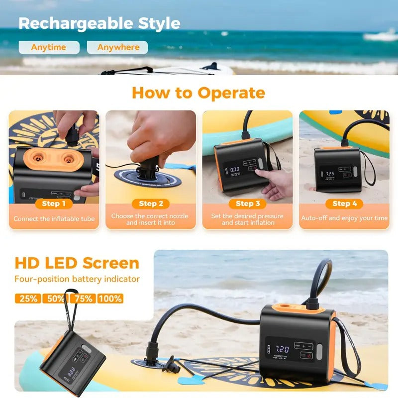 The  Large Smart Inflatable Pump is designed to make inflation and deflation tasks faster and more efficient. It supports a wide range of items including tents, mattresses, kayaks, and surfboards. The dual function allows you to inflate or deflate with ease, while the LCD display lets you adjust between PSI and Bar for precise control. Its rechargeable lithium battery provides cordless operation, making it ideal for travel and outdoor activities.