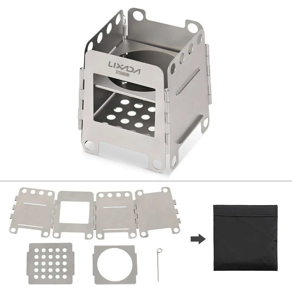 Set Includes: Folding titanium wood stove, mini alcohol stove, storage pouch