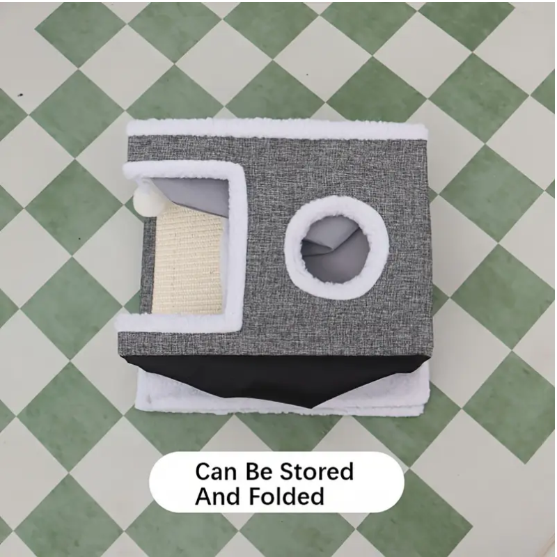 The  Luxury Double-Layer Cat Bed Cave Sofa provides your cat or small dog with a stylish space for rest and play. Its dual-purpose design includes an enclosed cave for privacy and a lounging area above for relaxation. Crafted from soft, durable nylon and featuring a sisal scratching surface, this bed supports your pet's natural behaviors while protecting your furniture. The foldable structure allows for easy storage, and the non-slip base keeps it securely in place. Dimensions are 41 cm x 41 cm x 32 cm (refer to the image).