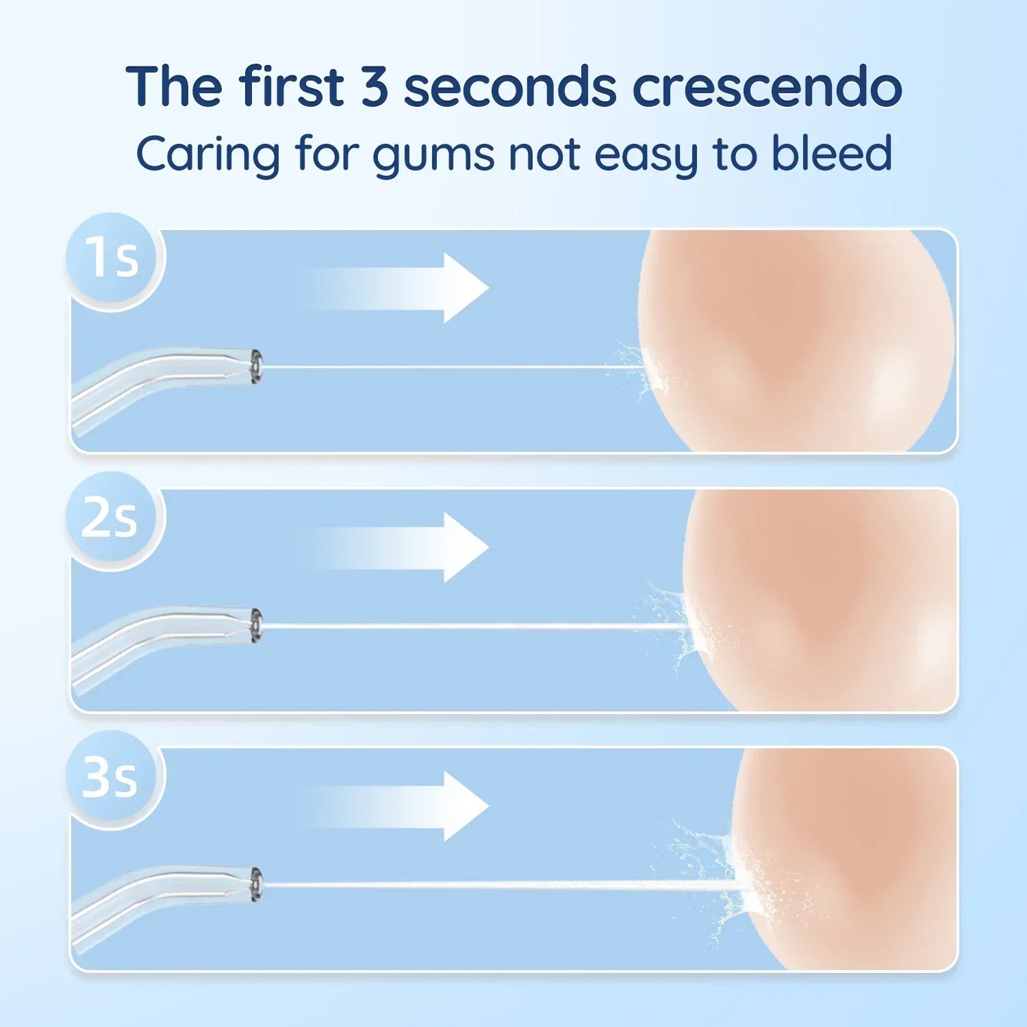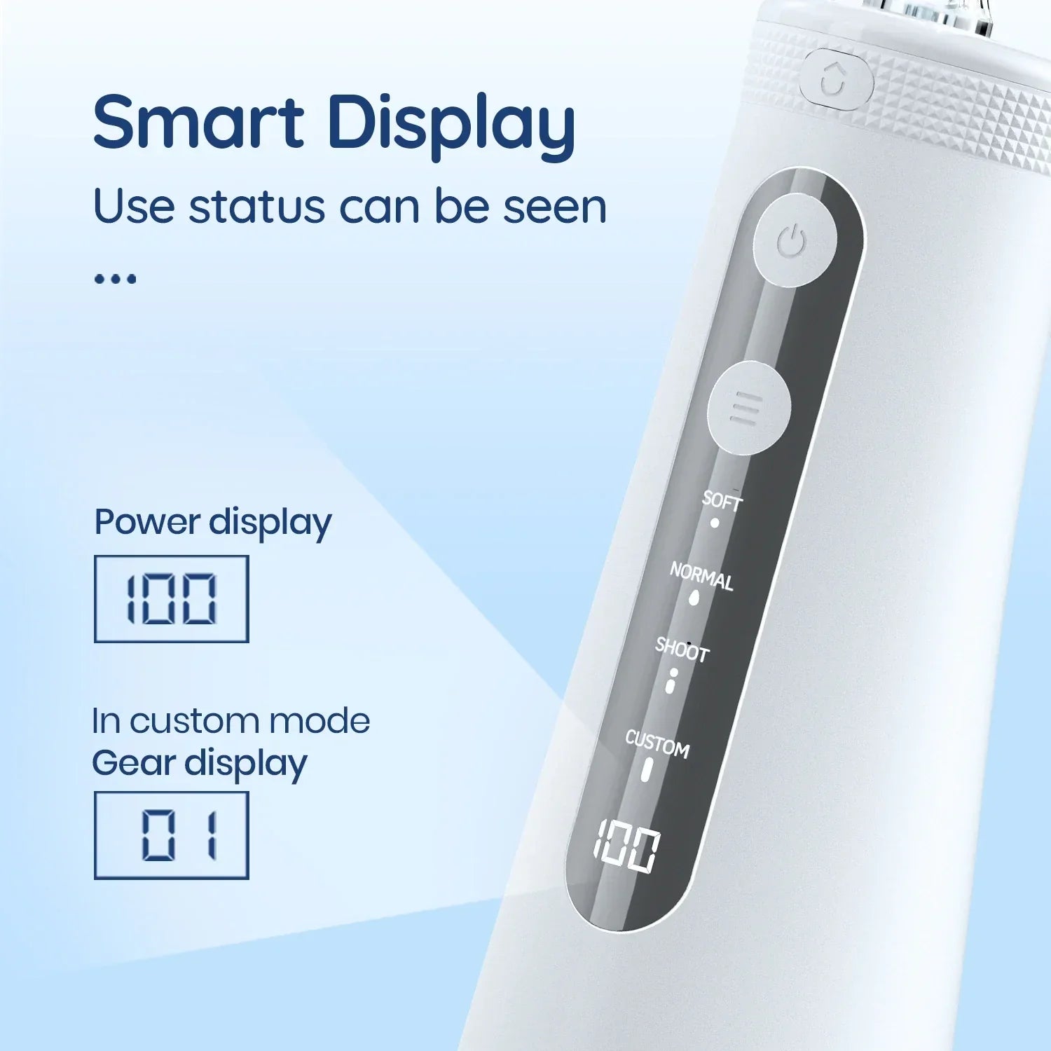 The irrigator offers four customizable modes, catering to different preferences and requirements. The LED digital display provides a clear indication of power levels, making it easy to monitor usage. Additionally, the device features a unique function where the water pressure gradually increases over three seconds, providing a comfortable adjustment period for users.