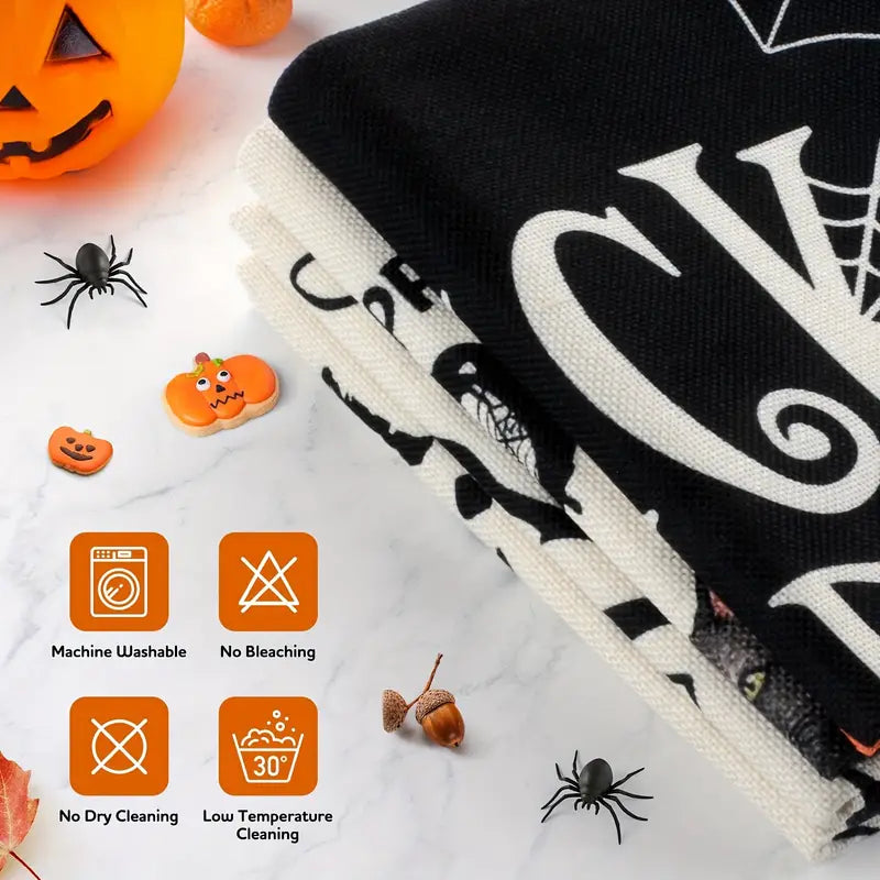 Description: Get ready for Halloween with our charming set of vintage-style pillow covers. This 4-pack features delightful designs that celebrate the spooky season, including pumpkins, playful cats, eerie spider webs, and fluttering bats. Each pillow cover is crafted from high-quality 100% linen, offering both durability and a touch of classic elegance to your decor.