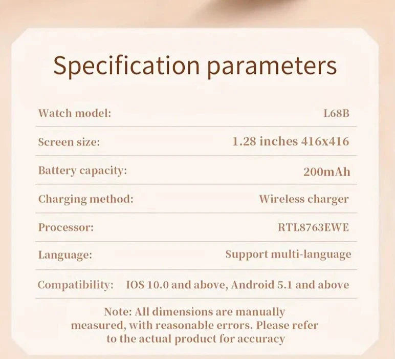 Description: Elevate your everyday style and functionality with our Golden Wireless Call Smart Watch designed specifically for women. With its sleek round case shape and alloy band material, this smartwatch seamlessly blends fashion and technology. The 3.25cm HD display provides clear visuals, while the wireless call feature ensures you can stay connected wherever you are. Whether you're hitting the gym or running errands, take advantage of the multi-sports modes to track your workouts effectively. Receive important information alerts directly on your wrist, and monitor your fitness goals with calories and sleep tracking. Plus, with the convenience of a voice assistant and sports pedometer, this smartwatch is the perfect companion for your active lifestyle. Powered by a rechargeable lithium polymer battery, you can enjoy continuous use without worrying about running out of power. Upgrade your accessory collection with the Golden Wireless Call Smart Watch and experience the perfect blend of style and functionality.
