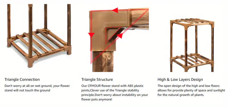 - STURDY and DURABLE : Bold wood can better support the flowerpot,makes our plant stand shelf load bearing up to 50 lbs. Plastic connector bottom attached to protect the plant rack in humid ground;Extend the service life of the flower stand.