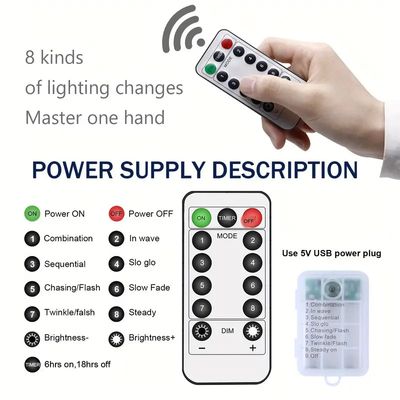 - 4.8 Modes String Lights including Combination, Wave Flash, Alternating Flash, Breath, Chase, Slow Flash, Flash, and Constant Light; Just one button to get your favorite lighting mode. 5. Suitable for indoor and outdoor decoration, widely used for birthday parties, Thanksgiving, Christmas, weddings, parties, holidays, festivals, autumn lights with garlands, etc.