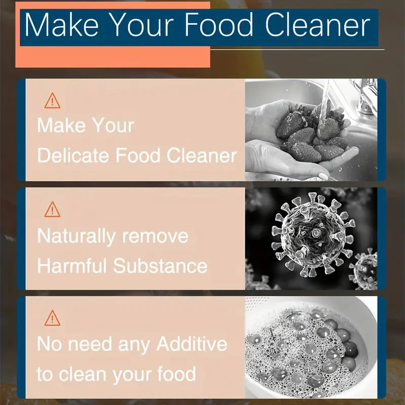 Safe and Healthy: Bid farewell to harmful chemicals and pesticides. Our fruit purifier employs natural purification technology to eliminate dirt, bacteria, and impurities, ensuring the safety and health of your food.