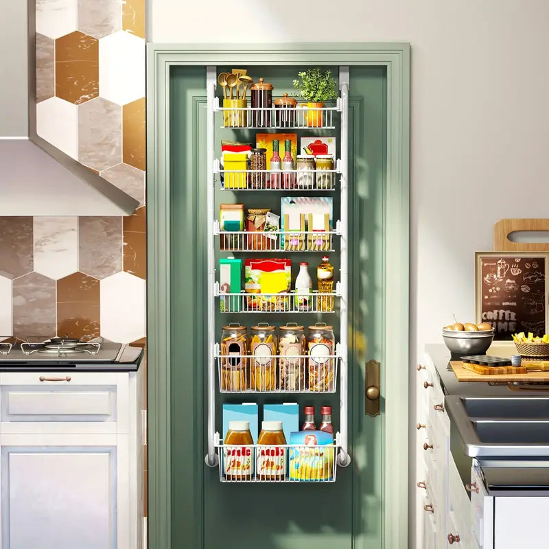 Description: Upgrade your kitchen storage with our Multi-Layer Metal Hanging Storage Basket - the perfect solution for keeping your pantry organized and maximizing space. This over-the-door organizer features six tiers (4 small and 2 big baskets) to accommodate a variety of daily kitchen seasoning supplies.