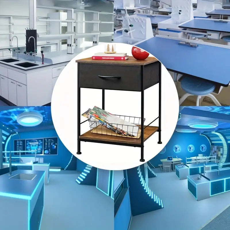 Rustic Black Metal Nightstand with Fabric Drawer