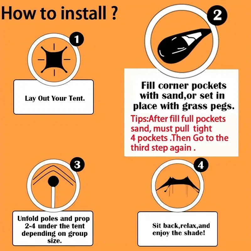 Fill the sandbag with sand or stones to enhance wind resistance, allowing you to set up the tent on various terrains such as sandy beaches, grassy areas, or rocky camping spots with ease. Its versatile design makes it suitable for gardens, backyards, lawns, picnics, group activities, and more. Easily adjust the sand anchors or poles to customize the shade angle for optimal sun protection.
