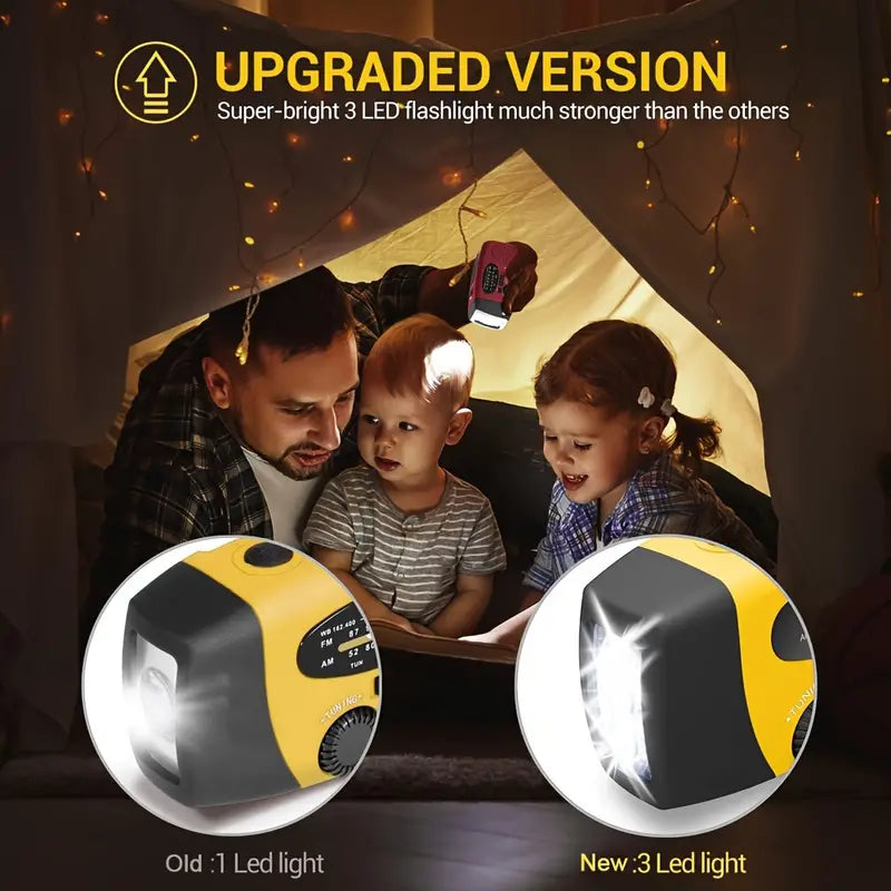 - Hand Crank and Solar Powered: Stay connected even when the power is out by hand cranking or utilizing solar charging.