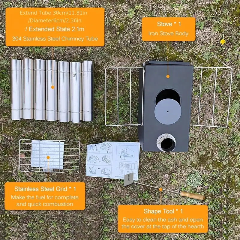 Description: Experience the ultimate convenience and warmth on your outdoor adventures with our Portable Wood Burning Tent Stove. Crafted from high-quality iron with a durable high-temperature plastic spraying, this stove ensures long-term use and provides ample warmth and heat for your camping or hunting trips.