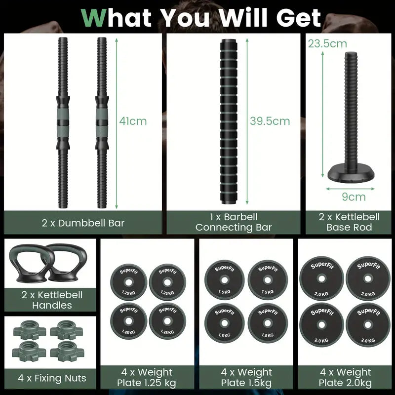 Crafted from high-quality iron and featuring weight discs with durable PVC edges, this set is designed to withstand intense workouts while protecting your floors. The adjustable weight plates provide a range of weight choices, making it suitable for all fitness levels. The barbell bar includes a foam sleeve for extra comfort during heavy lifting, and the kettlebell handles are anti-slip with a sturdy base for stability during your exercises.