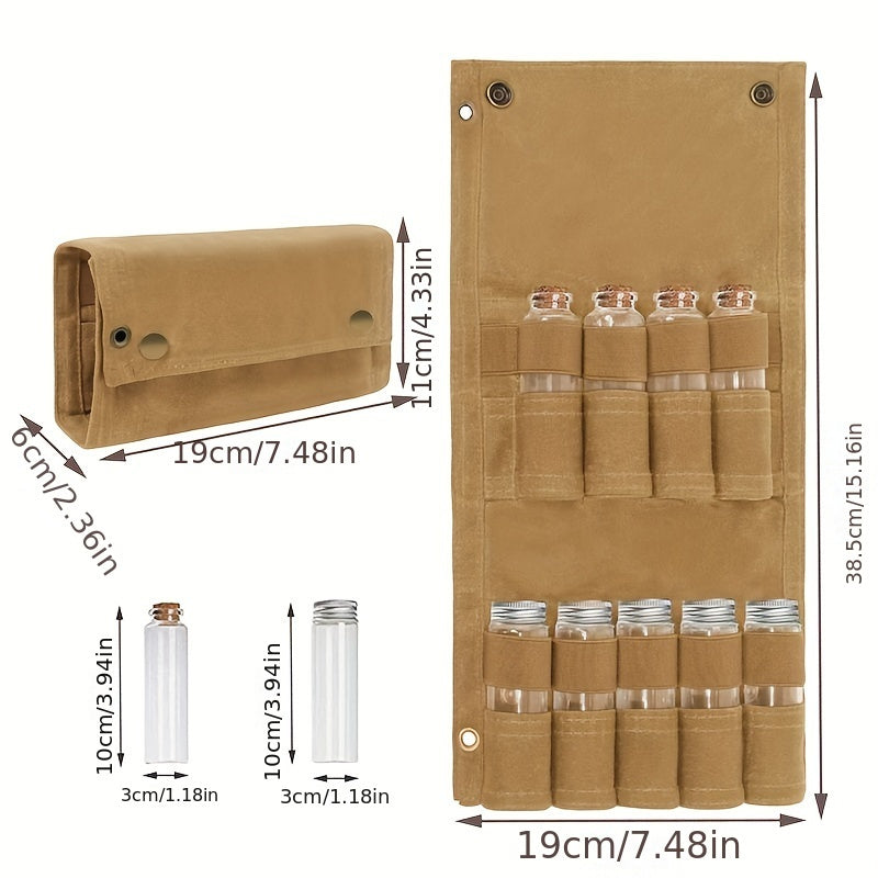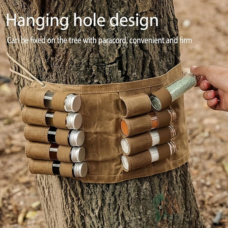 The  Portable Spice Jar Set is your all-in-one solution for seasoning on the go. Featuring 9 reusable glass jars with both wooden and aluminum lids, you can store both powdered and liquid condiments safely without leaks. The compact waxed canvas bag includes snug compartments and elastic straps to keep everything neatly in place during travel. Perfect for campers, outdoor cooks, or mobile chefs, this kit combines durability with convenience in one compact set. Its foldable design makes it easy to pack, while the sturdy construction ensures long-term use for any adventure.