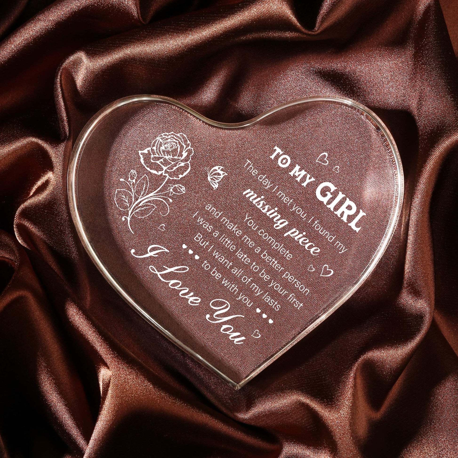 This NNETM Heart-Shaped Acrylic Keepsake is a perfect romantic gift for your girlfriend. Its elegant and simple design makes it a meaningful addition to any space, whether displayed on a desk, shelf, or mantel. This keepsake requires no power supply, offering hassle-free display while celebrating your love in a timeless way.
