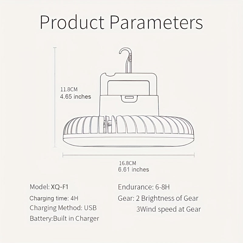 The  Portable Camping Fan Light is your reliable outdoor companion, combining cooling and lighting in one compact device. Designed for adventurers, it features a rechargeable 2400mAh battery, USB charging, and both a hook and strong magnetic base for easy attachment anywhere. With 400 lumens of brightness and a 100 cm lighting range, it ensures visibility and comfort during camping, hiking, or any outdoor activity.