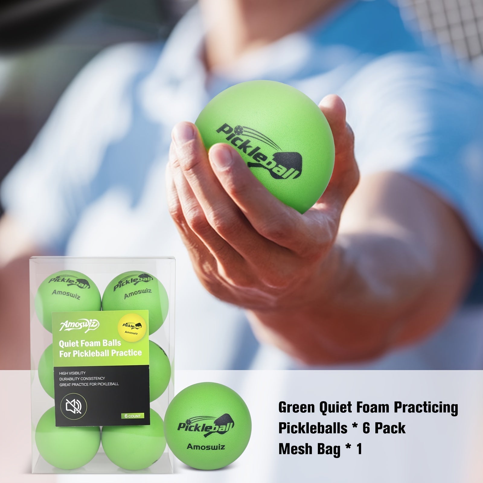 Quiet Foam Pickleballs are designed for players seeking a quieter, controlled training experience both indoors and outdoors. With a diameter of 7.3 cm, these soft foam balls offer the feel of standard pickleballs while minimizing sound and impact. Each pack includes six green balls and a convenient white mesh bag for storage.