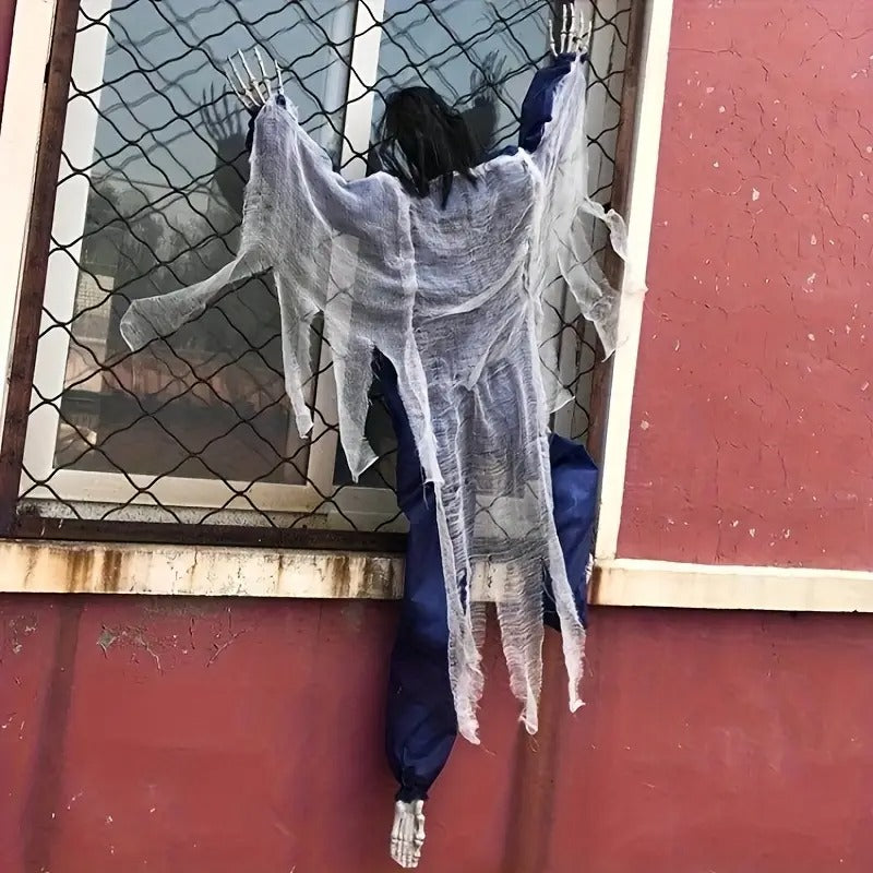 The Skeleton Mannequin Halloween Wall Climbing Decoration stands at 150 cm, designed to create a spine-chilling effect for haunted houses, parties, and seasonal displays. Its climbing pose and eerie skull with long hair make it an eye-catching addition to any outdoor setup. Crafted from polyester and rubber, this mannequin is lightweight yet sturdy, ensuring you can easily mount it on walls.