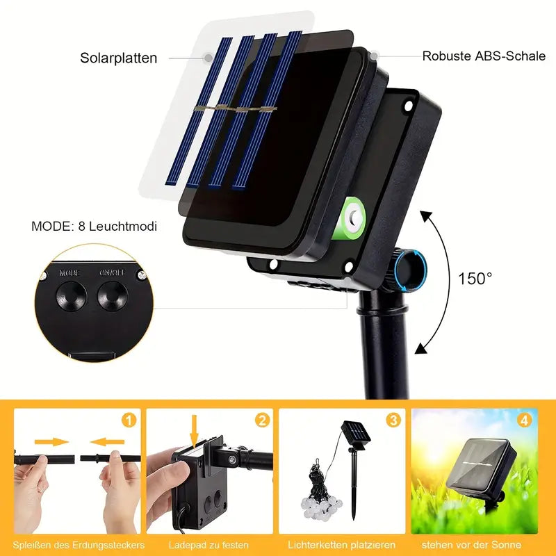 Constructed with durability in mind, these lights are water-resistant (IP65) and are powered by solar charging, ensuring a hassle-free setup. The light sensor automatically controls the lighting modes, offering 8 different options to suit your mood and occasion.