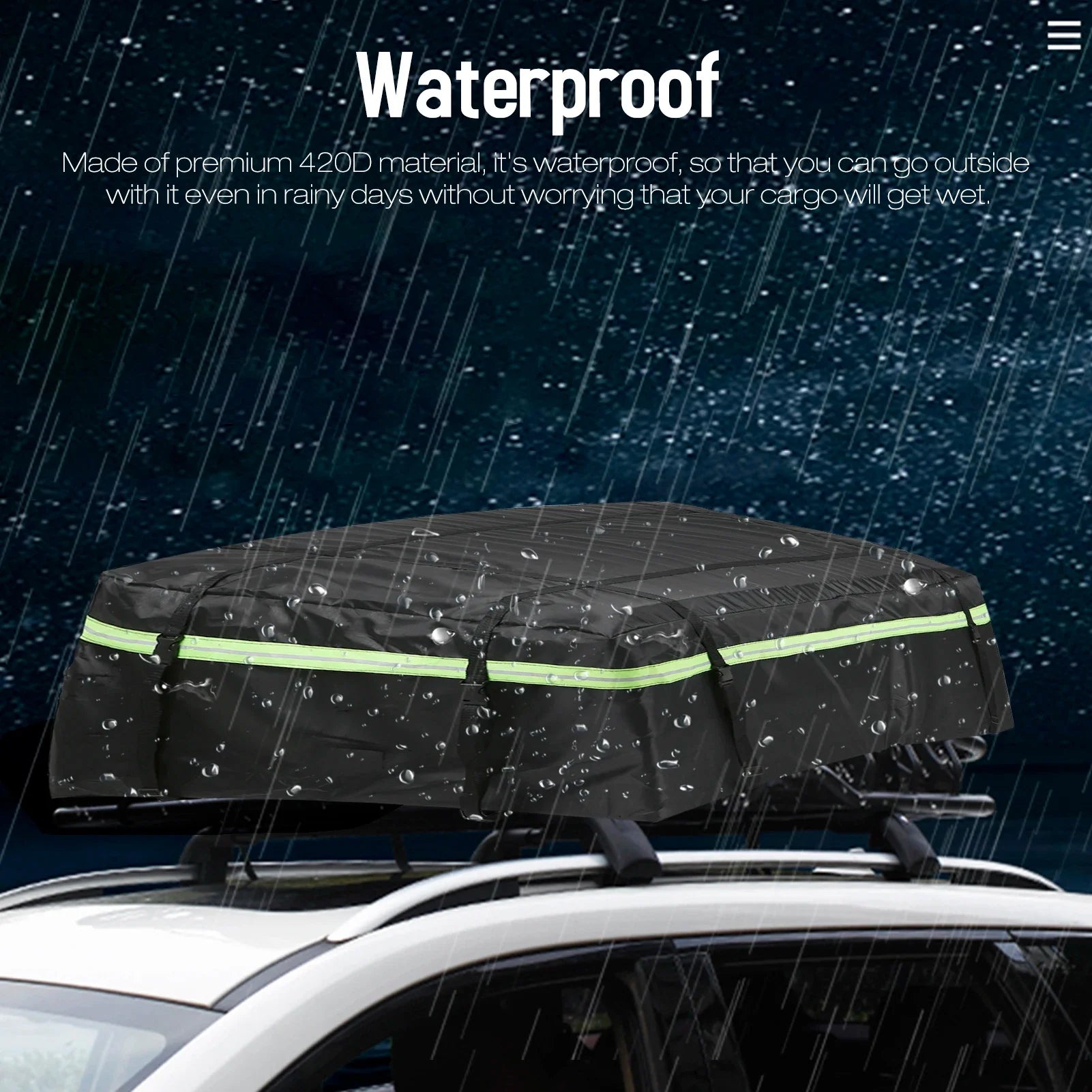 Designed for ultimate convenience, this rooftop cargo carrier features a two-way zipper for easy loading and unloading, and adjustable buckle straps to keep everything secure while driving. Reflective strips add visibility at night, while the foldable, no-frame construction makes it easy to store when not in use. Whether your car has roof racks or not, this cargo bag is your reliable companion for hassle-free travel.