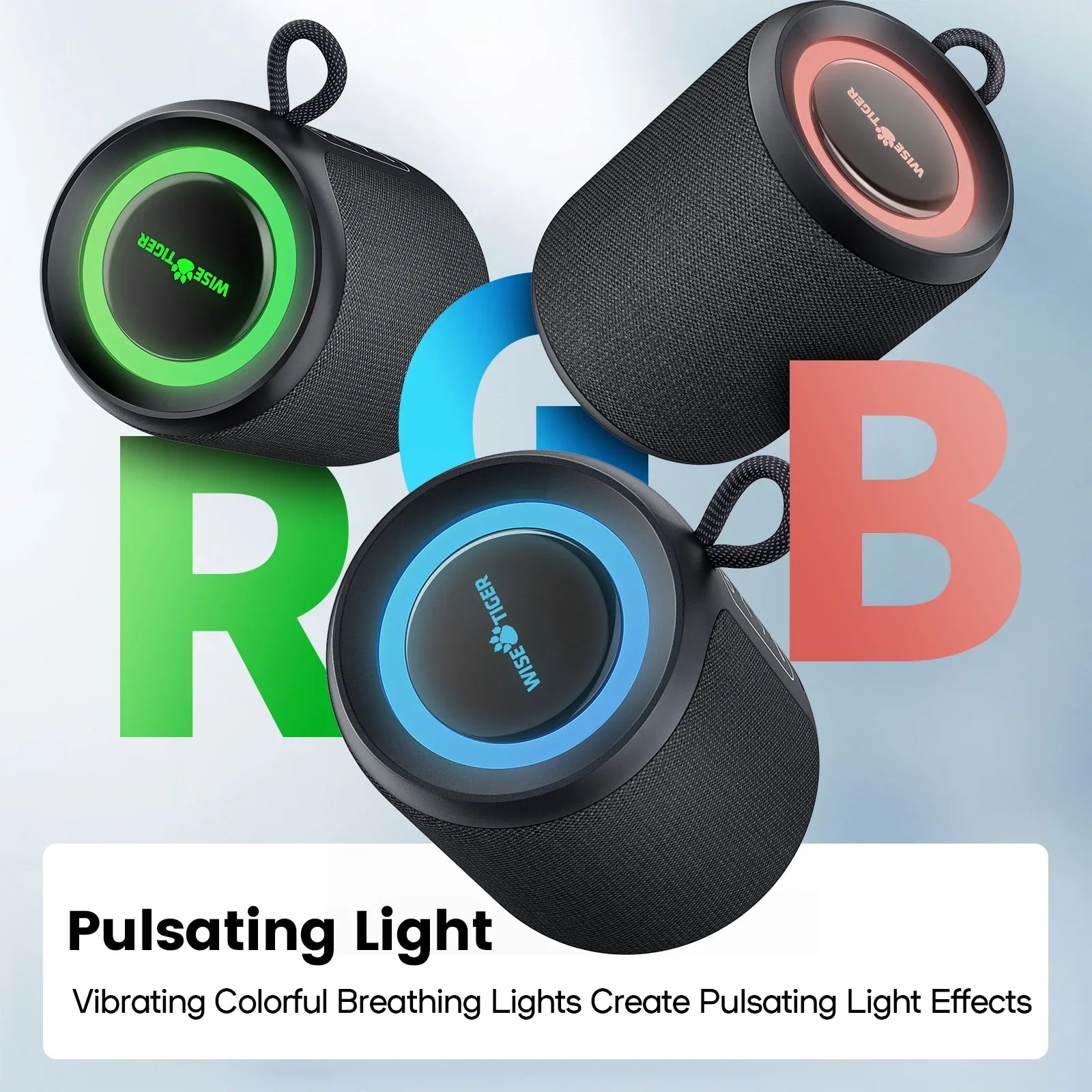 Portable, waterproof Bluetooth speaker with rich sound, TWS pairing, and vibrant LED lights. Perfect for outdoor adventures!