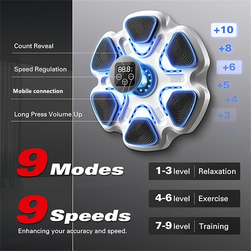 The  Wireless Music Punching Machine is your all-in-one smart training partner designed for intense home workouts. With real-time feedback, music-synced guidance, and multi-directional punch tracking, this wall-mounted unit helps you build power, speed, and coordination. Its wireless design and USB-rechargeable lithium battery ensure a hassle-free setup that fits any home gym.