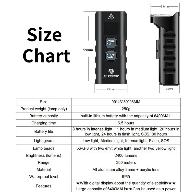 Illuminate every ride with the 6400mAh Rechargeable Bike Front Light, a powerful and smart lighting solution for cyclists who ride day or night. With 2400 lumens of brightness and a beam distance reaching 300 meters, this headlight offers unbeatable visibility on dark trails, city streets, or foggy paths. Its built-in 6400mAh lithium battery not only powers the light for up to 30 hours, but also doubles as a power bank to charge your phone or cycling computer on the go.